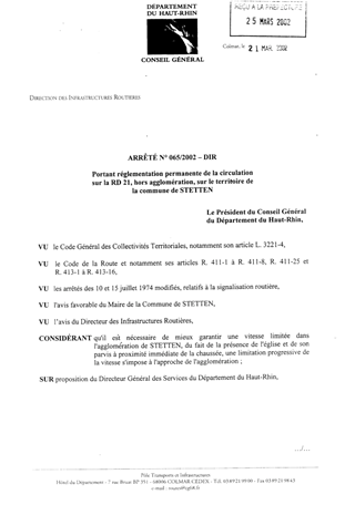 Portant réglementation permanente de la circulation sur la RD 21, hors agglomération, sur le territoire de la commune de STETTEN Resumé Pièces jointes ARRETE Assemblée : Non défini Date : 21/03/2002 Rapporteur : Non défini Collectivité : Conseil départemental du Haut-Rhin Direction : Non défini Service : Direction des Routes Domaine : Circulation Commission :