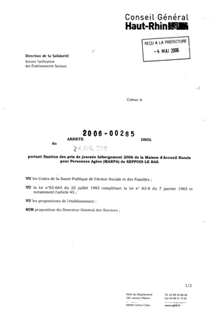 portant fixation des prix de journée hébergement 2006 de la maison d'accueil rurale pour personnes âgées (MARPA) de SEPPOIS LE BAS. Resumé Pièces jointes ARRETE Assemblée : Non défini Date : 24/04/2006 Rapporteur : Non défini Collectivité : Conseil départemental du Haut-Rhin Direction : Non défini Service : Service de la Tarification des Etablissements Domaine : Prix de Journée Commission :