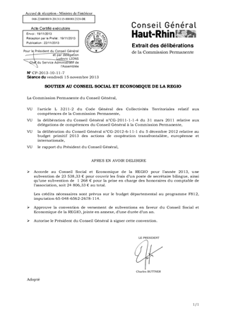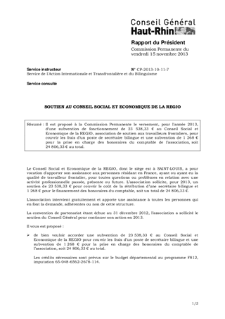 Il est proposé à la Commission Permanente le versement, pour l'année 2013, d’une subvention de fonctionnement de 23 538,33 € au Conseil Social et Economique de la REGIO, association de soutien aux travailleurs frontaliers, pour couvrir les frais d’un poste de secrétaire bilingue et une subvention de 1 268 € pour la prise en charge des honoraires du comptable de l’association, soit 24 806,33 € au total.