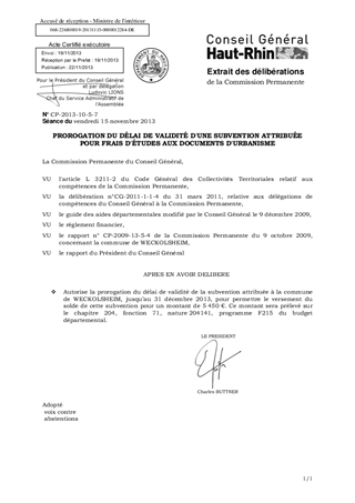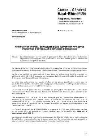 Le présent rapport a pour objet de proroger la durée de validité d'une subvention départementale attribuée à la commune de WECKOLSHEIM pour la révision de son Plan d'Occupation des Sols.