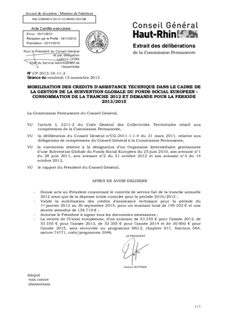 L’Assemblée Départementale, par décisions du 5 novembre 2010, du 23 septembre 2011 et du 18 octobre 2012, a approuvé la mobilisation, par le Conseil Général, des crédits d’assistance technique, auxquels il peut prétendre en tant qu’organisme intermédiaire, gestionnaire d’une subvention globale du Fonds Social Européen pour la période 2010/2012. Le présent rapport propose de prendre acte de la consommation de ces crédits pour l’année 2012 et de la dépense totale cumulée pour la période 2010/2012. Le Département étant prolongé en sa qualité d’organisme intermédiaire pour les années 2013 et 2014, il est également proposé de valider la mobilisation de crédits d’assistance technique pour la période allant du 1er janvier 2013 au 30 septembre 2015 à hauteur de 195 302 € dont 136 710 € à la charge de l’Europe, et d’autoriser le Président du Conseil Général à signer l’ensemble des documents nécessaires.