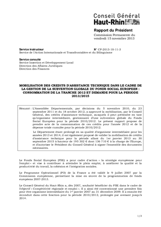 MOBILISATION DES CREDITS D'ASSISTANCE TECHNIQUE DANS LE CADRE DE LA GESTION DE LA SUBVENTION GLOBALE DU FONDS SOCIAL EUROPEEN : CONSOMMATION DE LA TRANCHE 2012 ET DEMANDE POUR LA PERIODE 2013/2015