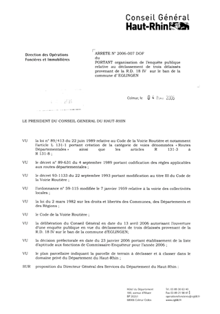 portant organisation de l'enquête publique relative au déclassement de trois délaissés provenant de la R.D. 18 IV sur le ban de la commune d'EGLINGEN. Resumé Pièces jointes ARRETE Assemblée : Non défini Date : 04/05/2006 Rapporteur : Non défini Collectivité : Conseil départemental du Haut-Rhin Direction : Non défini Service : Service du Patrimoine et du droit des Sols Domaine : Déclassement de voirie Commission :