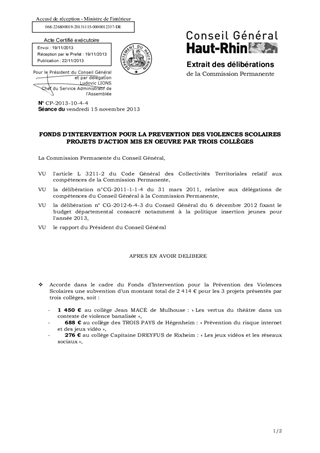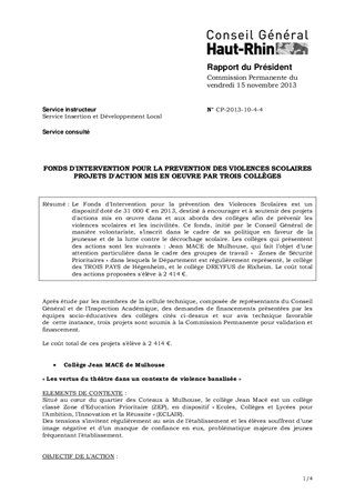 Le Fonds d'Intervention pour la prévention des Violences Scolaires est un dispositif doté de 31 000 € en 2013, destiné à encourager et à soutenir des projets d'actions mis en œuvre dans et aux abords des collèges afin de prévenir les violences scolaires et les incivilités. Ce fonds, initié par le Conseil Général de manière volontariste, s’inscrit dans le cadre de sa politique en faveur de la jeunesse et de la lutte contre le décrochage scolaire. Les collèges qui présentent des actions sont les suivants : Jean MACE de Mulhouse, qui fait l’objet d’une attention particulière dans le cadre des groupes de travail « Zones de Sécurité Prioritaires » dans lesquels le Département est régulièrement représenté, le collège des TROIS PAYS de Hégenheim, et le collège DREYFUS de Rixheim. Le coût total des actions proposées s'élève à 2 414 €.