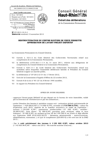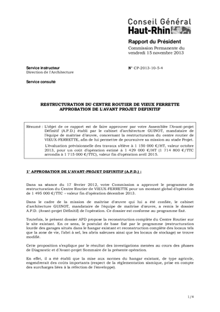 L’objet de ce rapport est de faire approuver par votre Assemblée l’Avant-projet Définitif (A.P.D.) établi par le cabinet d’architecture GUINOT, mandataire de l’équipe de maîtrise d’œuvre, concernant la restructuration du centre routier de VIEUX-FERRETTE, afin de lui permettre de poursuivre sa mission au stade Projet. L’évaluation prévisionnelle des travaux s’élève à 1 150 000 €/HT, valeur octobre 2013, pour un coût d’opération estimé à 1 429 000 €/HT (1 714 800 €/TTC arrondis à 1 715 000 €/TTC), valeur fin d’opération avril 2015.