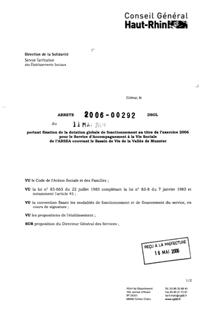 portant fixation de la dotation globale de fonctionnement au titre de l'exercice 2006 pour le service d'accompagnement à la vie sociale de l'ARSEA couvrant le bassin de vie de la vallée de Munster. Resumé Pièces jointes ARRETE Assemblée : Non défini Date : 11/05/2006 Rapporteur : Non défini Collectivité : Conseil départemental du Haut-Rhin Direction : Non défini Service : Service de la Tarification des Etablissements Domaine : Dotations financières Commission :