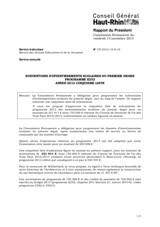 SUBVENTIONS D'INVESTISSEMENTS SCOLAIRES DU PREMIER DEGRE PROGRAMME E252 ANNEE 2013 CINQUIEME LISTE