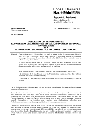 Conformément aux dispositions de l’article 34 de la loi de finances rectificative pour 2010 du 29 décembre 2010, les travaux de révision des valeurs locatives des locaux professionnels devront être achevés d’ici 2014 afin d’être intégrés dans le calcul des impôts de 2015. Le décret d’application, paru le 9 novembre 2013, fixe au 9 décembre 2013 la date butoir pour désigner nos représentants au sein de chacune des deux commissions départementales créées pour les besoins de la révision. Il est proposé à notre Assemblée de procéder à la désignation en séance de : - 2 titulaires et 2 suppléants pour la Commission départementale des valeurs locatives des locaux professionnels ; - 1 titulaire et 1 suppléant pour la Commission départementale des impôts directs locaux