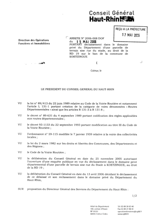 portant déclassement dans le domaine privé du Département d'une parcelle de terrain sise rue du Stade, au droit de la RD 19 sur le ban de la commune de KOETZINGUE. Resumé Pièces jointes ARRETE Assemblée : Non défini Date : 15/05/2006 Rapporteur : Non défini Collectivité : Conseil départemental du Haut-Rhin Direction : Non défini Service : Service du Patrimoine et du droit des Sols Domaine : Déclassement de voirie Commission :