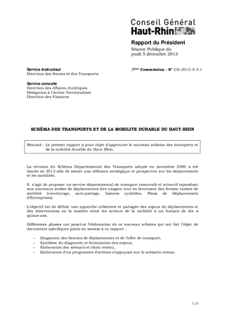 Le présent rapport a pour objet d'approuver le nouveau schéma des transports et de la mobilité durable du Haut-Rhin.
