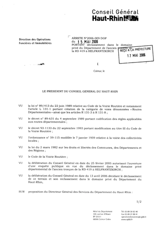 portant déclassement dans le domaine privé du Département de l'ancien tronçon de la RD 419 à HELFRANTZKIRCH. Resumé Pièces jointes ARRETE Assemblée : Non défini Date : 15/05/2006 Rapporteur : Non défini Collectivité : Conseil départemental du Haut-Rhin Direction : Non défini Service : Service du Patrimoine et du droit des Sols Domaine : Déclassement de voirie Commission :