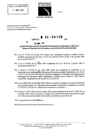 Portant fixation des pix de journée hébergement et dépendance 2002 de la maison de retraite de la fondation Jean Dollfus à MULHOUSE Resumé Pièces jointes ARRETE Assemblée : Non défini Date : 21/03/2002 Rapporteur : Non défini Collectivité : Conseil départemental du Haut-Rhin Direction : Non défini Service : Service de la Tarification des Etablissements Domaine : Prix de Journée Commission :