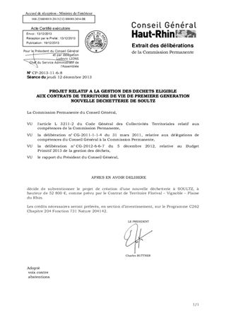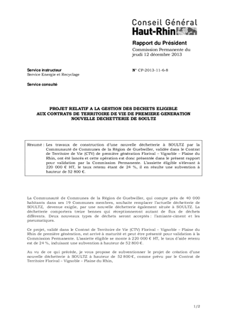 Les travaux de construction d’une nouvelle déchetterie à SOULTZ par la Communauté de Communes de la Région de Guebwiller, validée dans le Contrat de Territoire de Vie (CTV) de première génération Florival – Vignoble – Plaine du Rhin, ont été lancés et cette opération est donc présentée dans le présent rapport pour validation par la Commission Permanente. L’assiette éligible s'élevant à 220 000 € HT, le taux retenu étant de 24 %, il en résulte une subvention à hauteur de 52 800 €.