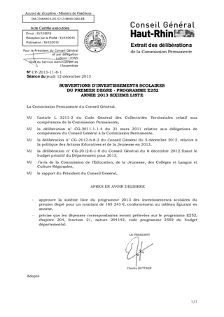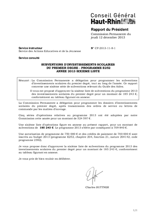 SUBVENTIONS D'INVESTISSEMENTS SCOLAIRES DU PREMIER DEGRE PROGRAMME E252 ANNEE 2013 SIXIEME LISTE