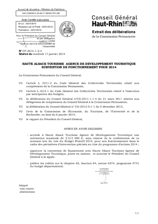 HAUTE ALSACE TOURISME AGENCE DE DEVELOPPEMENT TOURISTIQUE SUBVENTION DE FONCTIONNEMENT POUR 2014