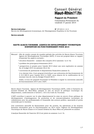 Afin de rendre compte de manière globale des activités de Haute-Alsace Tourisme Agence de Développement Touristique (ADT), il vous est proposé dans ce rapport d'examiner les aspects suivants : * situation financière - analyse des comptes 2012 (annexes 1a et 1b) * synthèse des principaux événements 2013 * perspectives et projets pour l'année 2014 (dont une note explicative en annexe 2a, le budget 2014 en annexes 2b et 2c) * convention de partenariat et disposistions financières (annexe 3). A ce dernier titre, il est proposé d'atttribuer une subvention de fonctionnement de 2 313 000 € pour l'année 2014 à l'ADT, sous réserve de la confirmation de ce montant lors du vote du Budget Primitif 2014. Enfin, il vous est proposé d'autoriser le Président à signer la convention annuelle de fonctionnement 2014 avec l'ADT.