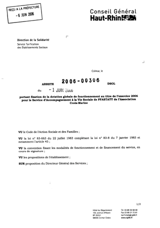 portant fixation de la dotation globale de fonctionnement au titre de l'exercice 2006 pour le service d'accompagnement à la vie sociale de PFASTATT de l'Association Croix-Marine. Resumé Pièces jointes ARRETE Assemblée : Non défini Date : 01/06/2006 Rapporteur : Non défini Collectivité : Conseil départemental du Haut-Rhin Direction : Non défini Service : Service de la Tarification des Etablissements Domaine : Dotations financières Commission :