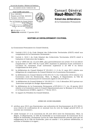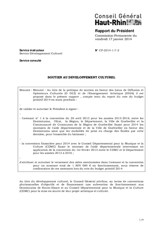 Résumé : Au titre de la politique de soutien en faveur des Lieux de Diffusion et Opérateurs Culturels (D O22) et de l'Enseignement Artistique (D026) il est proposé dans le présent rapport , compte tenu du report du vote du budget primitif 2014 en mars prochain : de valider et autoriser le Président à signer : - l'avenant n° 1 à la convention du 26 avril 2013 pour les années 2013-2016, entre les Dominicains, l'Etat, la Région, le Département, la Ville de Guebwiller et la Communauté de Communes de la Région de Guebwiller fixant pour 2014 les montants de l'aide départementale et de la Ville de Guebwiller en faveur des Dominicains ainsi que les modalités de prise en charge des fluides par cette dernière, pour l'ensemble du bâtiment ; - la convention financière pour 2014 avec le Conseil Départemental pour la Musique et la Culture (CDMC) fixant le montant de l'aide départementale intervenant en application de la convention du 1er février 2013 entre le CDMC et le Département pour les années 2013 à 2016 ; d'attribuer et autoriser le versement des aides mentionnées dans l'avenant et la convention pour un montant total de 1 809 000 € en fonctionnement, sous réserve de confirmation de ces montants lors du vote du budget primitif 2014.