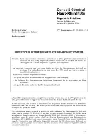 Suite aux nouvelles orientations concernant la 2ème génération des Contrats de Territoire de Vie (CTV) impactant certains dispositifs de soutien en faveur du Développement Culturel, le présent rapport a pour objectifs : - de rappeler l'ensemble des rubriques d'aides au titre du Développement Culturel, en précisant leur rattachement ou non dans les CTV ainsi que leurs sources et modalités d'application ; - d'actualiser certains dispositifs relevant : . du guide des aides à l'investissement (suppression d'une rubrique) ; . du Schéma des Enseignements Artistiques (versement de la subvention au 2ème semestre) ; . du guide des aides en faveur du Développement culturel.