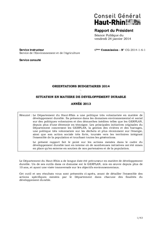 ORIENTATIONS BUDGETAIRES 2014 SITUATION EN MATIERE DE DEVELOPPEMENT DURABLE ANNÉE 2013