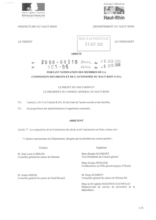 portant nomination des membres de la Commission des Droits et de l'Autonomie du Haut-Rhin Resumé Pièces jointes ARRETE Assemblée : Non défini Date : 06/06/2006 Rapporteur : Non défini Collectivité : Conseil départemental du Haut-Rhin Direction : Non défini Service : Direction de la Solidarité Domaine : Autres (non classés) Commission :