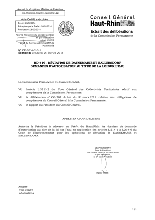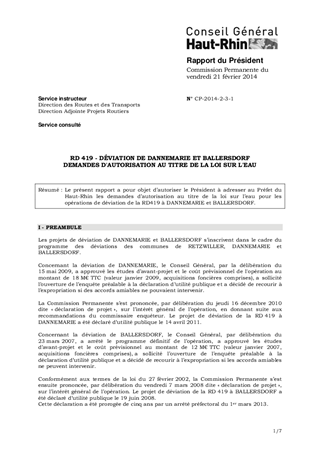 Le présent rapport a pour objet d’autoriser le Président à adresser au Préfet du Haut-Rhin les demandes d’autorisation au titre de la loi sur l’eau pour les opérations de déviation de la RD419 à DANNEMARIE et BALLERSDORF.