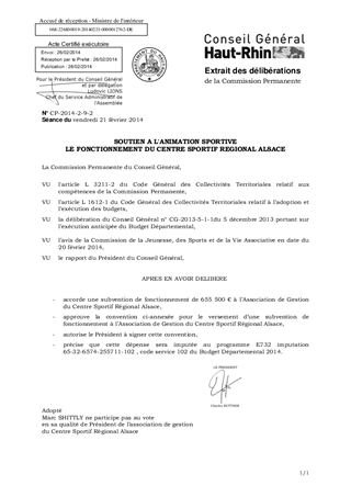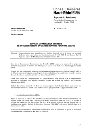 Conformément aux prévisions du Budget Primitif 2014, il vous est proposé d'allouer une subvention de fonctionnement de 655 500 € au Centre Sportif Régional Alsace de Mulhouse au titre de l'exercice 2014.