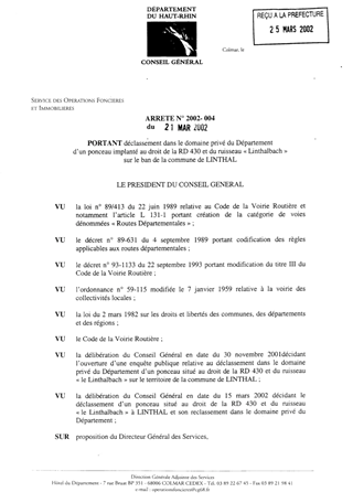 Portant déclassement dans le domaine privé du Département ponceau implanté au droit de la RD 430 et du ruisseau Linthalbach sur le abn de la commune de LINTHAL Resumé Pièces jointes ARRETE Assemblée : Non défini Date : 21/03/2002 Rapporteur : Non défini Collectivité : Conseil départemental du Haut-Rhin Direction : Non défini Service : Service du Patrimoine et du droit des Sols Domaine : Déclassement de voirie Commission :