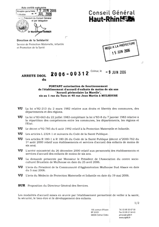 portant autorisation de fonctionnement de l'établissement d'accueil d'enfants de moins de six ans "Accueil périscolaire La Marelle", sis au 1 rue du Tarn et 45 rue Jean Martin à MULHOUSE. Resumé Pièces jointes ARRETE Assemblée : Non défini Date : 09/06/2006 Rapporteur : Non défini Collectivité : Conseil départemental du Haut-Rhin Direction : Non défini Service : Service de Protection Maternelle et Infantile Domaine : Accueil d'enfants Commission :