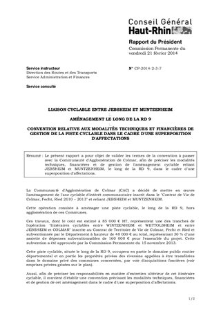 Le présent rapport a pour objet de valider les termes de la convention à passer avec la Communauté d'Agglomération de Colmar, afin de préciser les modalités techniques, financières et de gestion de l'aménagement cyclable reliant JEBSHEIM et MUNTZENHEIM, le long de la RD 9, dans le cadre d'une superposition d'affectations.
