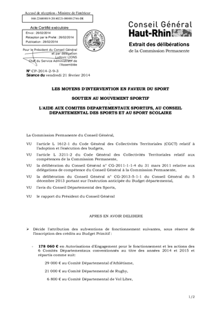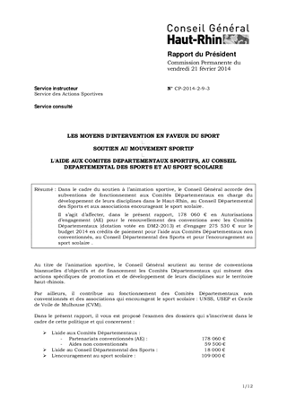 Dans le cadre du soutien à l’animation sportive, le Conseil Général accorde des subventions de fonctionnement aux Comités Départementaux en charge du développement de leurs disciplines dans le Haut-Rhin, au Conseil Départemental des Sports et aux associations encourageant le sport scolaire. Il s’agit d’affecter, dans le présent rapport, 178 060 € en Autorisations d’engagement (AE) pour le renouvellement des conventions avec les Comités Départementaux (dotation votée en DM2-2013) et d’engager 275 530 € sur le budget 2014 en crédits de paiement pour l’aide aux Comités Départementaux non conventionnés, au Conseil Départemental des Sports et pour l’encouragement au sport scolaire .