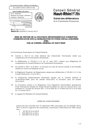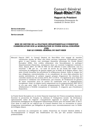 MISE EN OEUVRE DE LA POLITIQUE DÉPARTEMENTALE D'INSERTION COMMUNICATION SUR LA MOBILISATION DU FONDS SOCIAL EUROPÉEN (FSE) PAR LE CONSEIL GÉNÉRAL DU HAUT-RHIN