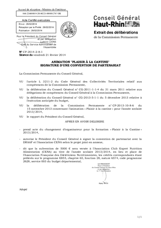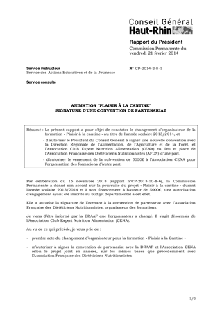 Le présent rapport a pour objet de constater le changement d’organisateur de la formation « Plaisir à la cantine » au titre de l’année scolaire 2013/2014, et - d’autoriser le Président du Conseil Général à signer une nouvelle convention avec la Direction Régionale de l’Alimentation, de l’Agriculture et de la Forêt, et l’Association Club Expert Nutrition Alimentation (CENA) en lieu et place de l’Association Française des Diététiciens Nutritionnistes (AFDN) d’une part, - d’autoriser le versement de la subvention de 5000€ à l’Association CENA pour l’organisation des formations d’autre part.