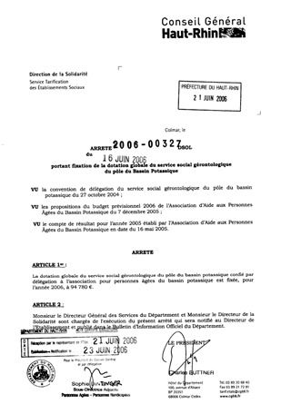 portant fixation de la dotation globale du service social gérontologique du pôle du Bassin Potassique. Resumé Pièces jointes ARRETE Assemblée : Non défini Date : 16/06/2006 Rapporteur : Non défini Collectivité : Conseil départemental du Haut-Rhin Direction : Non défini Service : Service de la Tarification des Etablissements Domaine : Autres (non classés) Commission :
