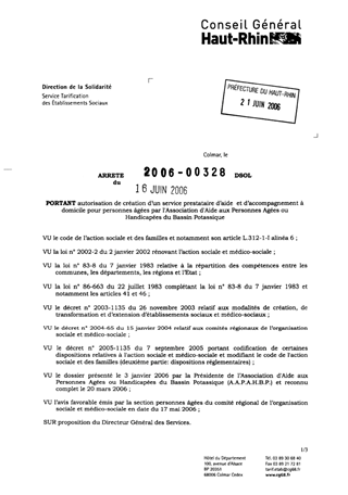 portant autorisation de création d'un service prestataire et d'accompagnement à domicile pour personnes âgées par l'Association d'Aide aux Personnes Agées ou Handicapées du Bassin Potassique. Resumé Pièces jointes ARRETE Assemblée : Non défini Date : 16/06/2006 Rapporteur : Non défini Collectivité : Conseil départemental du Haut-Rhin Direction : Non défini Service : Service de la Tarification des Etablissements Domaine : Autres (non classés) Commission :