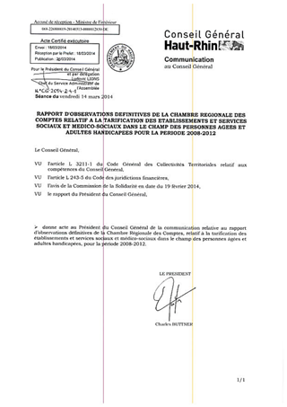 Le présent rapport a pour objet de communiquer à l'Assemblée les observations définitives, formulées par la Chambre Régionale des Comptes, à l'issue de son contrôle sur la tarification des établissements et services sociaux et médico-sociaux, dans le champ des personnes âgées et adultes handicapées. Ce contrôle a porté sur la période 2008-2012.