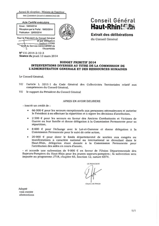 BUDGET PRIMITIF 2014 - INTERVENTIONS DIVERSES AU TITRE DE LA COMMISSION DE L'ADMINISTRATION GENERALE ET DES RESSOURCES HUMAINES Resumé Pièces jointes DELIBERATION RAPPORT Assemblée : Conseil General Date : 13/03/2014 Rapporteur : Non défini Collectivité : Conseil départemental du Haut-Rhin Direction : Non défini Service : Cabinet Domaine : Administration Commission : Assemblée Départementale