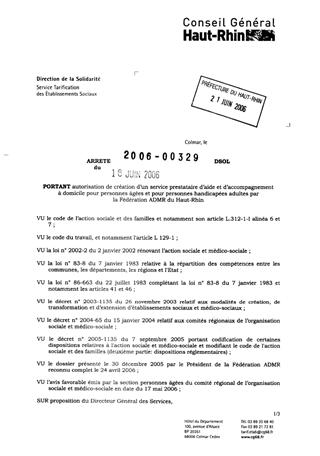 portant autorisation de création d'un service prestataire d'aide et d'accompagnement à domicile pour personnes âgées et pour personnes handicapées adultes par la Fédération ADMR du Haut-Rhin. Resumé Pièces jointes ARRETE Assemblée : Non défini Date : 16/06/2006 Rapporteur : Non défini Collectivité : Conseil départemental du Haut-Rhin Direction : Non défini Service : Service de la Tarification des Etablissements Domaine : Autres (non classés) Commission :