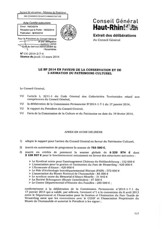 Les politiques départementales en faveur du patrimoine et de la conservation nécessitent l’inscription de 765 000 € en autorisation de programme et 6 329 974 € en crédits de paiement pour 2014. Un tiers de ces crédits de paiement concerne les dépenses de fonctionnement, soit 2 158 937 €. L’investissement représente 4 171 037 € notamment destinés aux Contrats des Territoires de Vie, ainsi qu’aux musées relevant du Contrat de Projets en cours et à l’aboutissement des travaux prévus au Hohlandsbourg, propriété départementale.