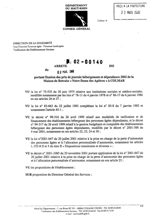 Portant fixation des prix de journée hébergement et dépendance 2002 de la maison de retraite Notre Dame des Apôtres à COLMAR Resumé Pièces jointes ARRETE Assemblée : Non défini Date : 22/03/2002 Rapporteur : Non défini Collectivité : Conseil départemental du Haut-Rhin Direction : Non défini Service : Service de la Tarification des Etablissements Domaine : Prix de Journée Commission :