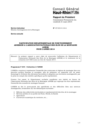 Le présent rapport a pour objet de renouveler l'adhésion du Département à l’Association Nationale des Elus de la Montagne (ANEM) et le versement de la cotisation de 8 000 euros au titre de l’année 2014.