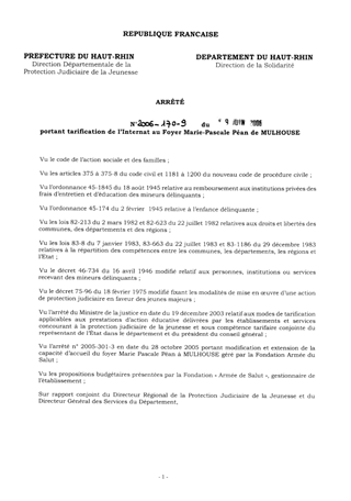 portant tarification de l'Internat au foyer Marie-Pascale Péan de MULHOUSE. Resumé Pièces jointes ARRETE Assemblée : Non défini Date : 19/06/2006 Rapporteur : Non défini Collectivité : Conseil départemental du Haut-Rhin Direction : Non défini Service : Direction de la Solidarité Domaine : Prix de Journée Commission :