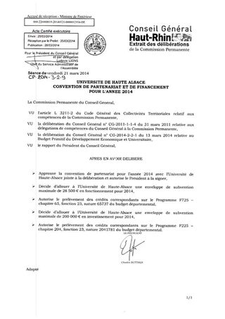 Dans le cadre du présent rapport, il est demandé : - d'approuver la convention de partenariat pour l'année 2014 avec l'Université de Haute-Alsace et de m'autoriser à la signer, - d'allouer à l'Université une enveloppe de subvention maximale de 28 500 € en fonctionnement, - de prélever les crédits correspondants sur le Programme F725 - Enseignement Supérieur et Recherche - chapitre 65 - fonction 23 - nature 65737 du budget départemental, - d'allouer à l'Université une enveloppe de subvention maximale de 200 000 € en investissement, - de prélever les crédits correspondants sur le Programme F225 - Enseignement Supérieur et Recherche - chapitre 204 - fonction 23 - nature 2041781 du budget départemental.