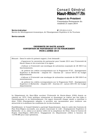 UNIVERSITE DE HAUTE ALSACECONVENTION DE PARTENARIAT ET DE FINANCEMENTPOUR L'ANNEE 2014