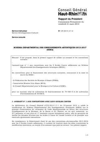 Il est proposé, dans le présent rapport de valider un avenant et les conventions suivants : l'avenant-type n° 1 aux conventions avec les 9 Ecoles Centre adhérentes au Schéma Départemental des Enseignements Artistiques (SDEA) ; les conventions pour le financement des structures suivantes, concourant à la mise en œuvre du SDEA : - la Fédération des Sociétés de Musique d'Alsace (FSMA), - l'association Mission Voix Alsace (MVA), - le Conseil Départemental pour la Musique et la Culture (CDMC), pour un montant total de subvention de fonctionnement de 79 000 € et de subvention d'investissement de 30 000 €.