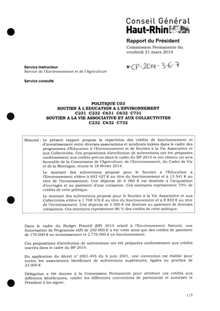 Le présent rapport propose la répartition des crédits de fonctionnement et d'investissement entre diverses associations et syndicats mixtes dans le cadre des programmes d’Education à l'Environnement et de Soutien à la Vie Associative et aux Collectivités. Ces propositions d’attribution de subventions ont été préparées conformément aux crédits prévus dans le cadre du BP 2014 et ont obtenu un avis favorable de la Commission de l'Agriculture, de l'Environnement, du Cadre de Vie et de la Montagne, réunie le 18 février 2014. Le montant des subventions proposé pour le Soutien à l’Education à l’Environnement s’élève à 693 427 € au titre du fonctionnement et à 13 541 € au titre de l’investissement. Une dépense de 6 060 € est destinée à l’acquisition d’ouvrages et au paiement d’une cotisation. Ces montants représentent 70% de crédits de cette politique. Le montant des subventions proposé pour le Soutien à la Vie Associative et aux Collectivités s’élève à 1 708 476 € au titre du fonctionnement et à 8 850 € au titre de l’investissement. Une dépense de 5 500 € est destinée au paiement de diverses cotisations. Ces montants représentent 86 % des crédits de cette politique.