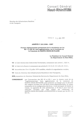 portant réglementation permanente de la circulation sur les RD1 et RD 45, hors agglomération, sur le territoire de la commune de SAINTE CROIX EN PLAINE. Resumé Pièces jointes ARRETE Assemblée : Non défini Date : 19/06/2006 Rapporteur : Non défini Collectivité : Conseil départemental du Haut-Rhin Direction : Non défini Service : Direction des Routes Domaine : Circulation Commission :