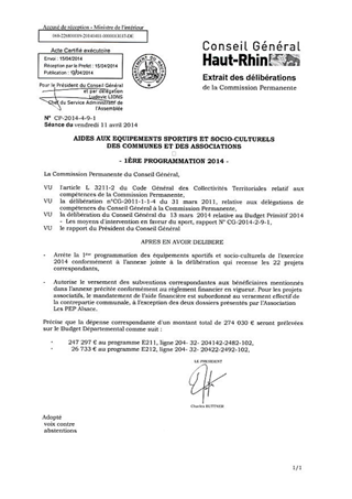 Lors du Budget Primitif 2014 rapport N° CG 2014-2-9-1 du 13 mars 2014 l'Assemblée départementale s'est prononcée pour un volume d'engagements de 400 000 € en faveur de la programmation des aides à l’investissement des communes et des associations et une inscription budgétaire de crédits de paiement de 4 846 606 €. Le présent rapport propose l'adoption définitive d'une première série d'opérations pour un montant de subventions s'élevant 274 030 €.