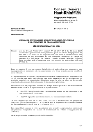 AIDES AUX EQUIPEMENTS SPORTIFS ET SOCIO-CULTURELSDES COMMUNES ET DES ASSOCIATIONS- 1ÈRE PROGRAMMATION 2014 -