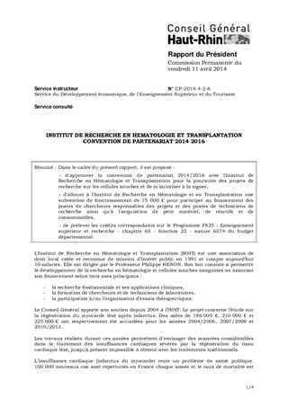 Dans le cadre du présent rapport, il est proposé : - d'approuver la convention de partenariat 2014/2016 avec l'Institut de Recherche en Hématologie et Transplantation pour la poursuite des projets de recherche sur les cellules souches et de m'autoriser à la signer, - d'allouer à l'Institut de Recherche en Hématologie et en Transplantation une subvention de fonctionnement de 75 000 € pour participer au financement des postes de chercheurs responsables des projets et des postes de techniciens de recherche ainsi qu'à l'acquisition de petit matériel, de réactifs et de consommables, - de prélever les crédits correspondants sur le Programme F825 - Enseignement supérieur et recherche - chapitre 65 - fonction 23 - nature 6574 du budget départemental.